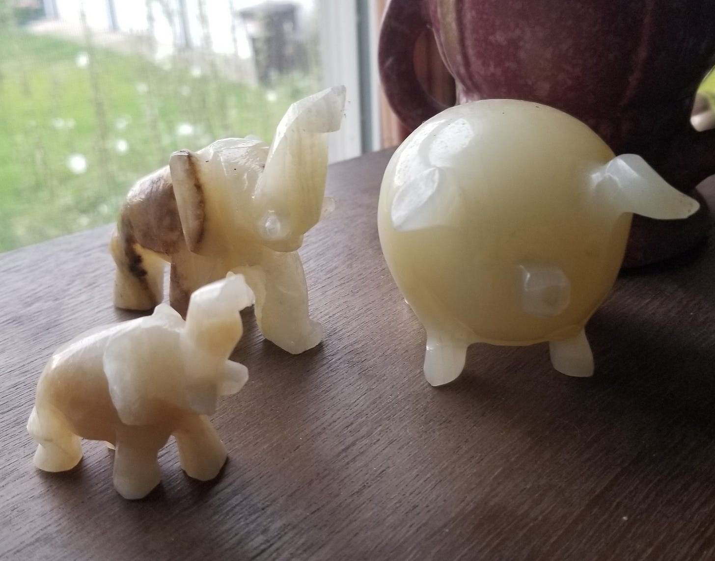 While a few of the elephants may also be onyx, I suspect one or two are calcite. I believe they came from an assortment of adventures, all from individual vacations and people. My grandma might have found some on her own, but I bet the collection began as a gift from someone else who traveled somewhere exotic.