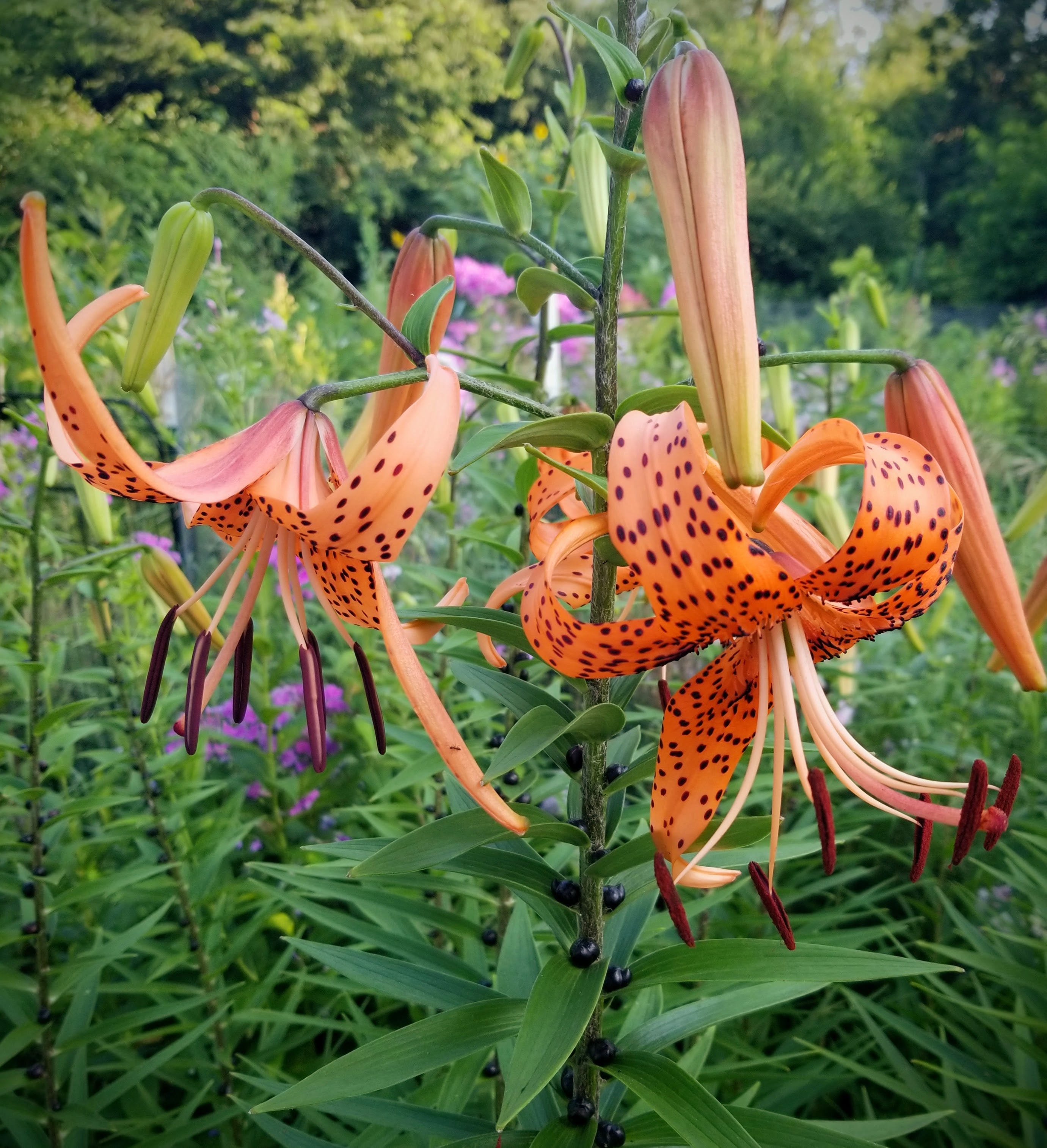 Two blooming Tiger Lily flowers on the same plant, each with unique features but both with stunning colors. A third bud appears at the top, a flower not yet opened.