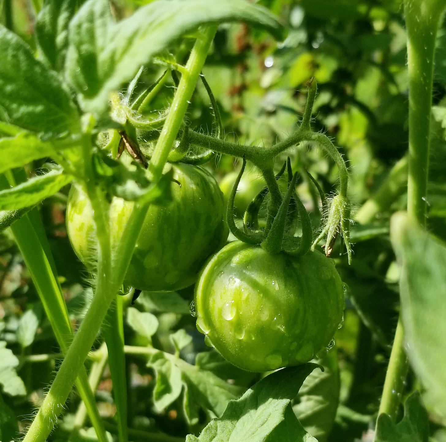 Red Zebra tomatoes a few hours after an early morning rain shower, just as the sun began to come up from behind the clouds moving off to the east. We’ve had a great deal of rain lately, well above average. Being at a higher elevation, the majority of the garden and its ecosystem are absolutely thriving. Nature always knows best.