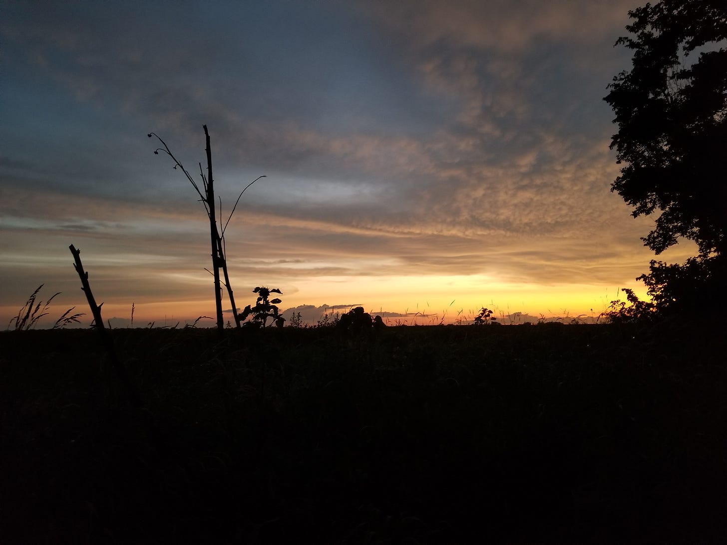 Sunset overlooking Sunflower Hill. The tall stalks are skeletons of last year’s sunflowers, with a small sunflower starting to regrow. Two lightning bugs are in the far right just under the horizon.