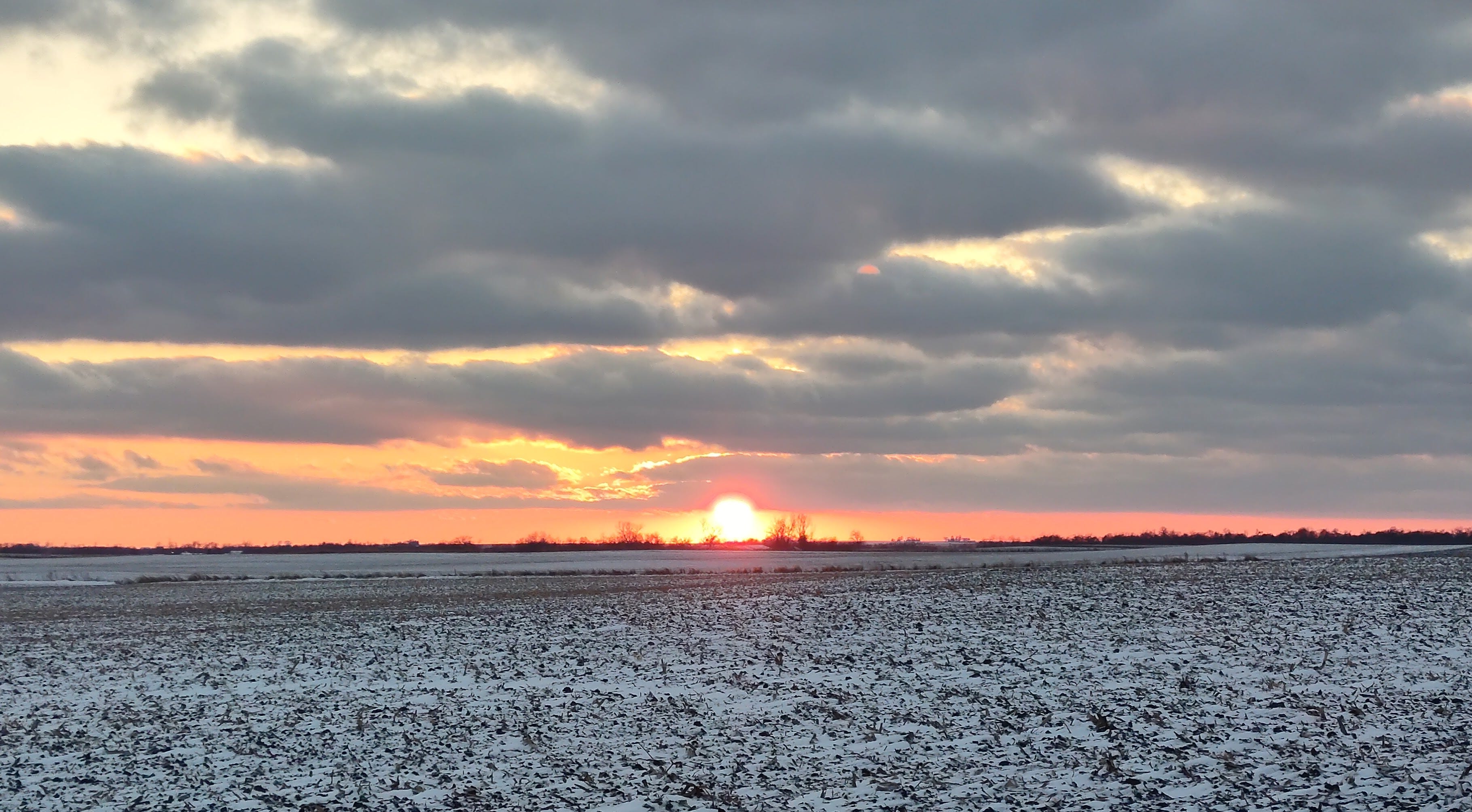 A snow dusted field in front of a late November sunset. Picture from 2023.