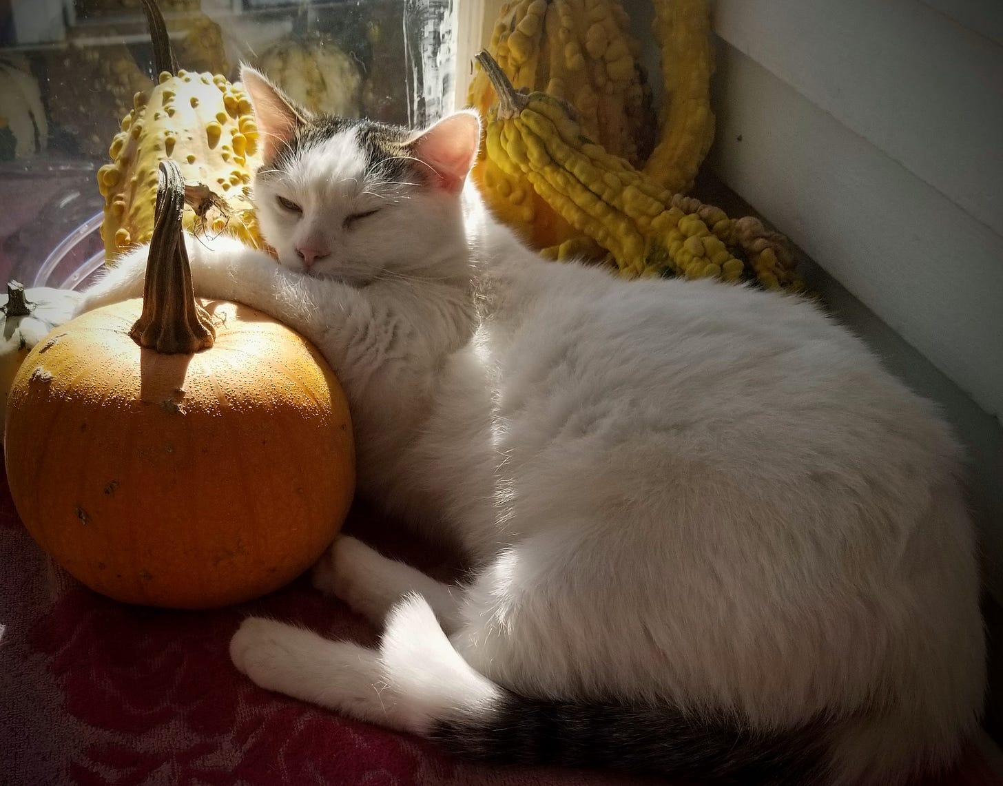 Picture from October 2024, featuring one of our many cats snoozing in a window amongst the pumpkin and gourds.